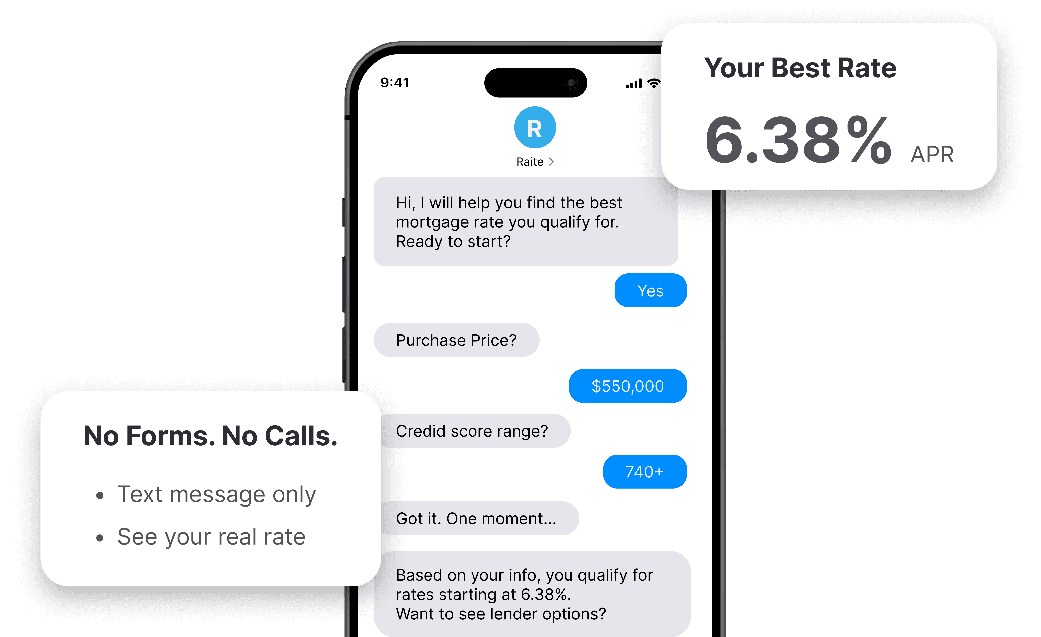 No forms. No Spam Calls. No sales pressure. Just text Raite, answer a few questions, and see what rate you actually qualify for.